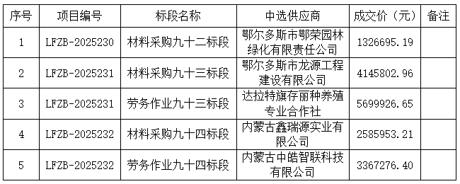 內(nèi)蒙古利凡工程項(xiàng)目管理有限公司受鄂爾多斯市水投惠源建設(shè)有限公司的委托,于2025年08月25日就內(nèi)蒙古自治區(qū)鄂爾多斯市庫布其沙漠北緣鎖邊林草帶西段、中段、東段沙化土地綜合治理項(xiàng)目--材料采購、勞務(wù)作業(yè)5個(gè)標(biāo)段以比選方式進(jìn)行采購,經(jīng)評審小組評議,現(xiàn)將本次采購的中選結(jié)果公告如下。